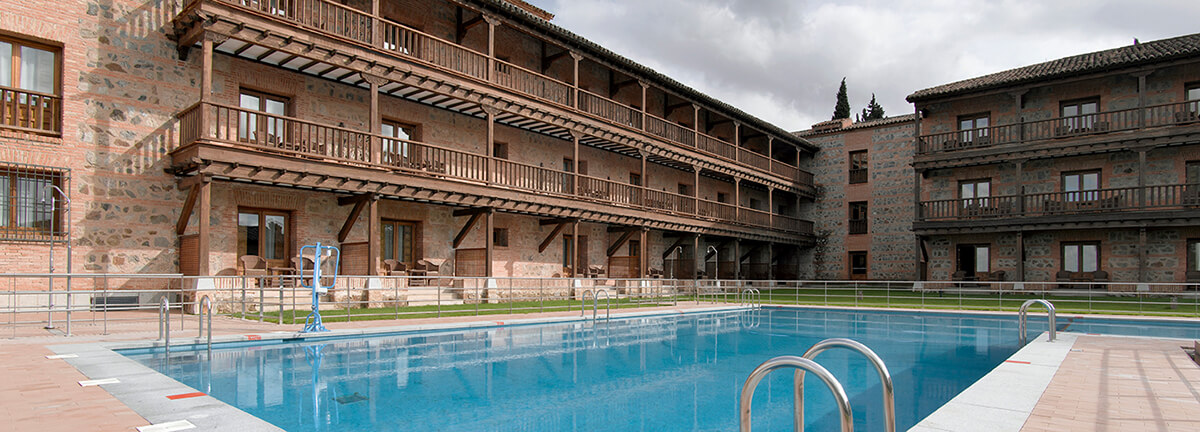 Das Hotel selbst greift die Architektur kastilischer Landhäuser auf: Naturstein, weite Terrassen und ruhige Innenräume bestimmen den Charakter. Die Zimmer sind großzügig geschnitten, hell und komfortabel ausgestattet; viele bieten einen direkten Blick auf die Altstadt mit Kathedrale, Alcázar und den Mäandern des Tajo.