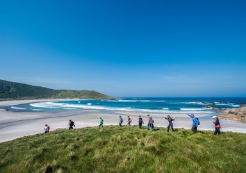 Zum krönenden Abschluss führt der Weg über den aussichtsreichen Höhenzug des Monte Branco zur Mündung des Río Anllóns. Von hier genießen Sie einen weiten Blick auf die Isla Tiñosa und die goldenen Dünen der Playa de Barra, durch die Sie die letzten Kilometer wie durch ein sandiges Küstenlabyrinth wandern – ein stilles Paradies für Vogelbeobachter.