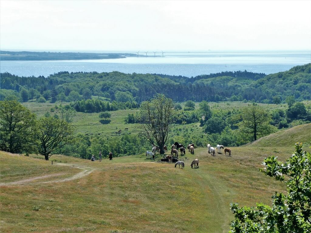 Die Wanderung führt weiter zu den bronzezeitlichen Grabhügeln Trehøje (127 m ü.M.), von deren Kuppen sich ein spektakulärer Blick über die hügelige Landschaft und die Küstenlinie eröffnet. Diese Aussicht verbindet Geschichte und Natur auf einzigartige Weise.