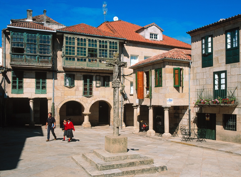 Praza de Fefiñanes: Malerischer Hauptplatz mit einem alten Adelspalast, dem Pazo de Fefiñanes aus dem 17. Jahrhundert und der Kirche San Benito aus dem 18. Jahrhundert.