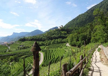 Am Morgen gehen Sie auf einem der charakteristischsten Wege des Meraner Landes los: dem Marlinger Waalweg. Diese Waale sind alte Bewässerungsanlagen; der Marlinger Waalweg gilt mit rund 12 km als längster Waalweg Südtirols und verläuft über weite Strecken angenehm eben entlang des Kanals. Immer wieder öffnen sich Blicke über das Meraner Becken und das Etschtal bis Richtung Bozen.