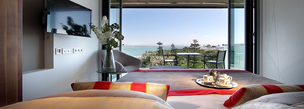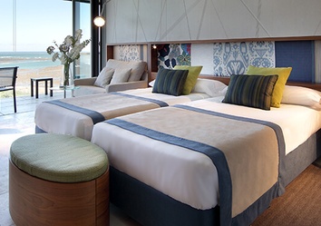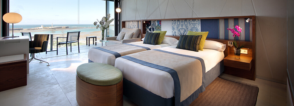 Die 124 Zimmer sind modern, lichtdurchflutet und in warmen Farbtönen gestaltet. Große Glasfronten geben den Blick auf das Meer, den Hafen oder die Dächer der Altstadt frei. Alle Zimmer verfügen über eine private Terrasse – perfekt, um den Sonnenuntergang über dem Atlantik zu erleben.