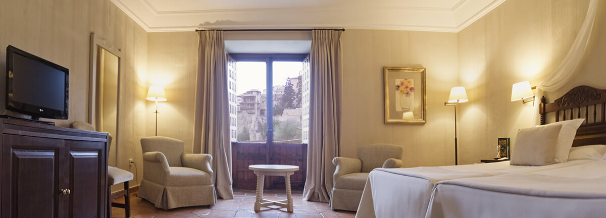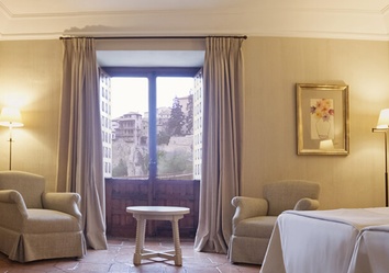 Der Parador liegt etwas außerhalb von Cuenca in der einzigartigen Gebiet von Hoz del Huécar, gegenüber den berühmten und einzigartigen hängenden Häusern. Der verglaste Kreuzgang und die ehemalige Kapelle, heute ein gemütliches Café, ergänzen ein Interieur, das sich durch die Kombination traditioneller Gestaltungselemente mit zeitgenössischen Details auszeichnet. Die Zimmer sind gemütlich und komfortabel, von denen einige einen Blick auf die hängenden Häuser - Casas Colgadas - bieten.