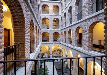 Im Inneren des Paradors erschließen sich drei Innenhöfe über vier Ebenen, verbunden durch Galerien mit stringent geführten Rundbögen. Die Architektur lässt die historische Struktur des Hauses deutlich spürbar werden.