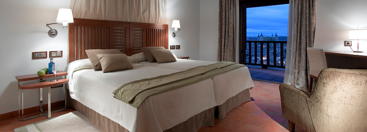 Das Hotel selbst greift die Architektur kastilischer Landhäuser auf: Naturstein, weite Terrassen und ruhige Innenräume bestimmen den Charakter. Die Zimmer sind großzügig geschnitten, hell und komfortabel ausgestattet; viele bieten einen direkten Blick auf die Altstadt mit Kathedrale, Alcázar und den Mäandern des Tajo.