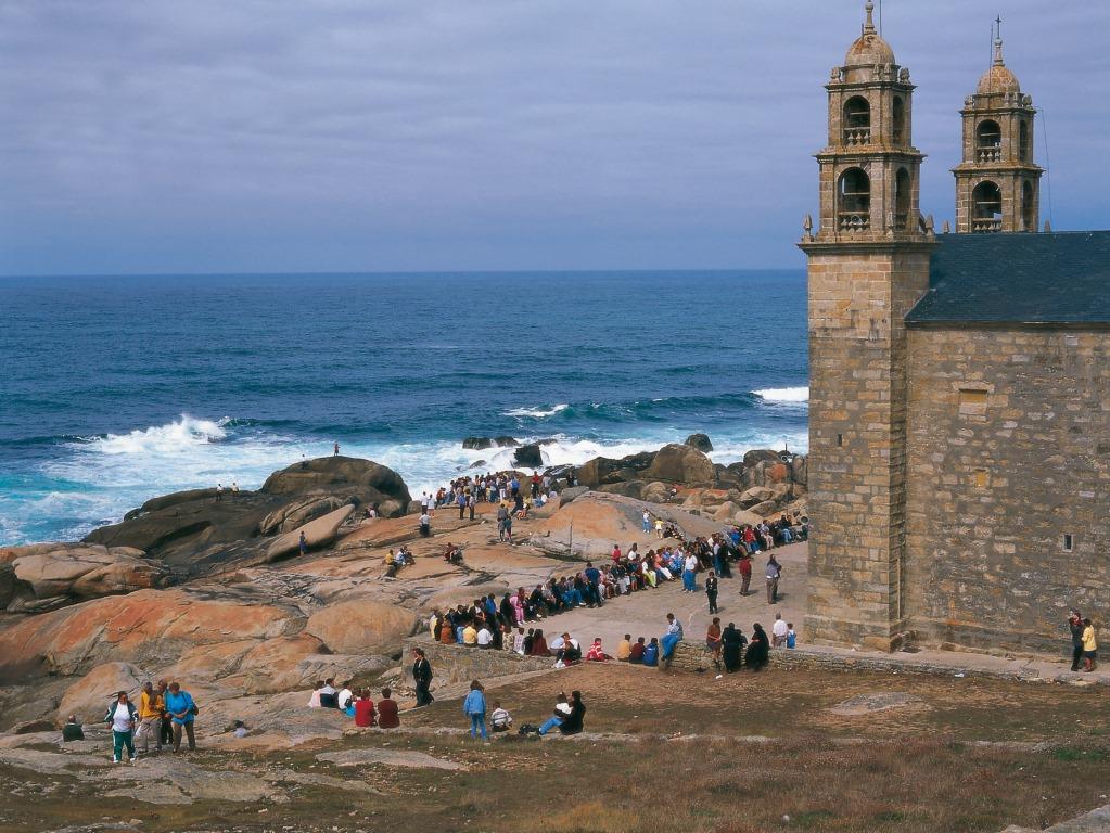 Hoch über den schroffen Klippen von Muxía wacht das Heiligtum der Virxe da Barca – eine der bedeutendsten Wallfahrtsstätten Galiciens. Der Überlieferung nach soll hier die Jungfrau Maria dem Apostel Jakobus erschienen sein – nicht etwa auf Wolken, sondern in einem steinernen Boot. Die umliegenden Felsformationen – wie der „Schiffsrumpf“ (Pedra de Abalar) oder das „Segel“ (Pedra dos Cadrís) – gelten seither als wundertätig.