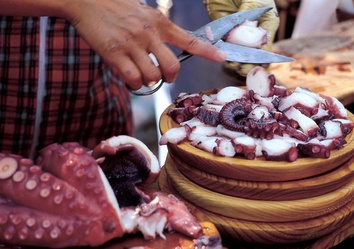 An der Küste ist der Reichtum an Fisch und Meeresfrüchten überwältigend. Empfehlenswert ist auf jeden Fall ein Fischeintopf oder das wohl bekannteste galicische Gericht "pulpo a feira", gekochte Krake mit Öl und Paprikagewürz. Im Landesinneren sind kräftige Fleischeintöpfe beliebt und als Nachtisch wird oft Milchreis "arroz con leche", Pfannkuchen oder ein mit Apfelmus servierter Flan serviert.